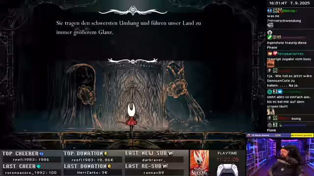 00:17:49Nach dem technischen Rückblick kündigt der Streamer an, heute eine lange Session mit Hollow Knight zu machen, um spoilern zu vermeiden, vorher aber noch ein Game-Duell zu spielen. Er äußert sich über die anstehende Veröffentlichung von Hollow Knight: Silksong und versichert, dass diese definitiv am nächsten Sonntag erscheinen wird. Er erwähnt zudem wiederholte Absagen und Verschiebungen der Veröffentlichung in der Vergangenheit, was seine Frustration über die Unzuverlässigkeit der Kommunikation seitens der Entwickler deutlich werden lässt.