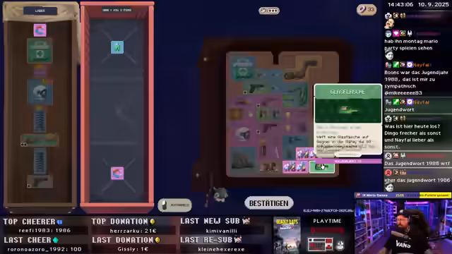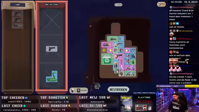 03:21:10Es wird überlegt, welche Waffen für den aktuellen Build am besten geeignet sind, wobei der Fokus auf Angriffstempo und Reload-Geschwindigkeit liegt. Der Streamer experimentiert mit verschiedenen Handfeuerwaffen und Revolvern, um den optimalen Waffentyp zu finden, der zum Charakter passt. Es wird das Inventar verwaltet, wobei entschieden wird, welche Gegenstände verkauft oder behalten werden sollen, um Platz für wichtigere Upgrades und Rucksäcke zu schaffen. Der Flummi wird als besonders nützlich für den aktuellen Build identifiziert, da er Kugeln von markierten Gegnern abprallen lässt und so zusätzlichen Schaden verursacht. Es wird der Shop besucht, um nach Rucksäcken und anderen nützlichen Gegenständen zu suchen, wobei der Fokus auf der Verbesserung des Inventars und der Erhöhung des Schadens liegt. Die Twitch-Extension wird kurz erwähnt, um die Zuschauerinteraktion zu fördern.