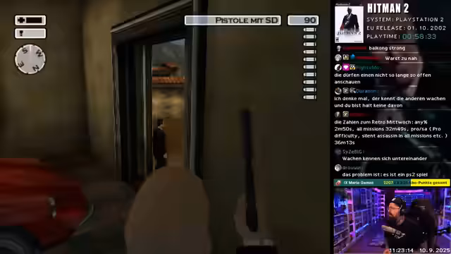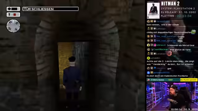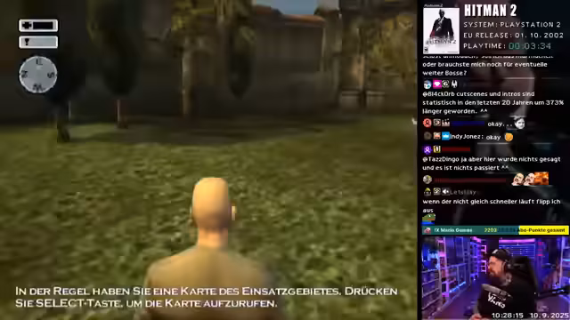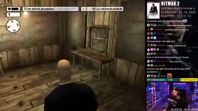 00:00:00Der Stream startet mit anfänglichen technischen Schwierigkeiten, die jedoch behoben werden konnten. Es wird erwähnt, dass nach der Hitman 2 Session noch das Spiel Deadly Days Roadtrip gespielt wird, für welches ein Key im Rahmen einer Kooperation erhalten wurde. Es gibt ein Leaderboard in diesem Spiel, in dem der Streamer sich verbessern möchte, was zu nächtlichen, süchtig machenden Sessions geführt hat. Geplant ist, etwa zur Hälfte des Streams, gegen 12 oder 1 Uhr, zu Deadly Days Roadtrip zu wechseln, um dort einige Runs zu machen und die Kooperation zu würdigen. Hitman 2 wird als Empfehlung aus dem Chat gespielt, obwohl noch nie zuvor ein Hitman-Spiel gespielt wurde. Die Erwartungen an die OG Steuerung auf der PS2 sind eher gering, aber die Vorfreude auf das Spiel ist groß. Es wird kurz auf die Grafik eingegangen und die ersten Schritte im Spiel werden kommentiert, inklusive der deutschen Sprachausgabe, die gemischte Gefühle hervorruft. Das Tutorial wird durchlaufen, wobei die ungewöhnliche Steuerung, insbesondere das Rennen auf L2, für Verwirrung sorgt. Die ersten Spielmechaniken wie das Benutzen des Schlüssellochs und das Schleichen werden ausprobiert. Es folgt eine Interaktion mit einer Spielfigur, die in einer Art Beichtstuhl sitzt, was zu humorvollen Kommentaren führt.