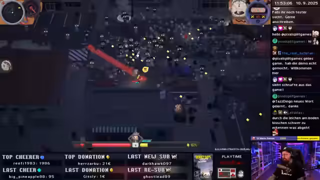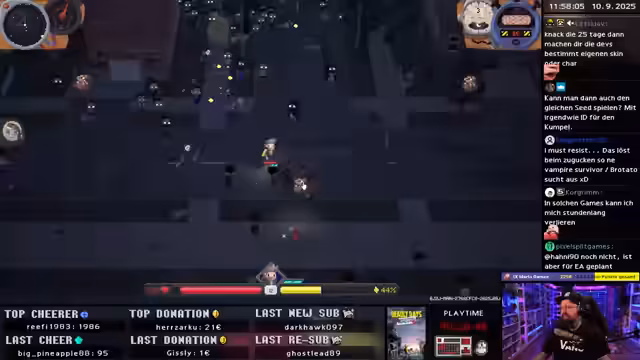 03:40:53Es wird angekündigt, dass der Streamer einen exklusiven Key für das Spiel erhalten hat, das am 22. des Monats veröffentlicht wird. Die Vorab-Spielmöglichkeit und das damit verbundene Leaderboard motivieren ihn sehr. Es wird über die Funktionsweise des Jojos diskutiert, das die Nachladedauer markierter Fernkampfwaffen verringert. Der Dart-Pfeil wird als besonders wertvoll angesehen und strategisch im Inventar platziert. Der Fokus liegt auf der Optimierung des Charakters durch den Einsatz von Movement Speed und das Sammeln von Sprit, um schnell voranzukommen. Der Sauger wird auf einer kleinen Map eingesetzt, um möglichst viel Sprit zu sammeln. Es werden Hanteln gefunden, die die benötigte Anzahl an Händen für markierte Waffen reduzieren könnten, aber der Streamer entscheidet sich, beim aktuellen Build zu bleiben.