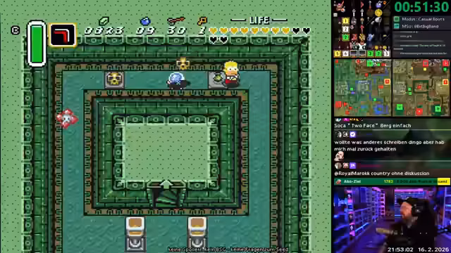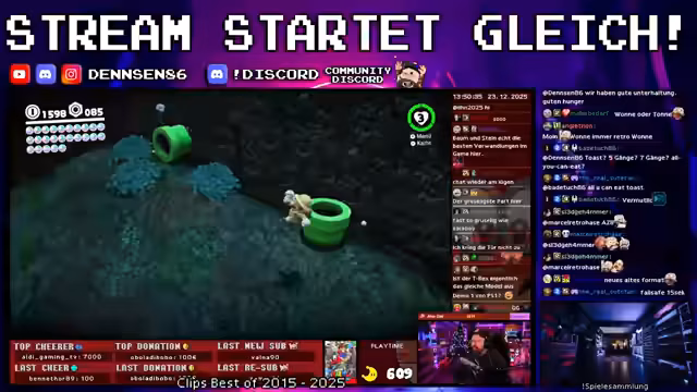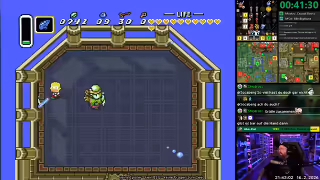 00:00:00Der Stream mit dem neuen Format 'NES Wonne oder Tonne!' beginnt. Streamer densen86 startet direkt in das Spiel, stößt jedoch auf mehrere technische und spielerische Schwierigkeiten. Er ist verärgert über die Steuerung und Mausprobleme, die ihm das Platzieren von Blöcken in Zelda ALTTPR erschweren. Er hat den Eindruck, sein Gegner hätte mit einer besseren Ausrüstung wie einer Wireless-Maus eine bessere Leistung erbracht, während er selbst mit einer geteilten Tastatur und ergonomischer Hardware kämpft. Trotz des anfänglichen Frusts zeigt er im weiteren Spielverlauf Verbesserungen und kann einen Bosskampf durchführen, was ihm positive Resonenz im Chat einbringt.