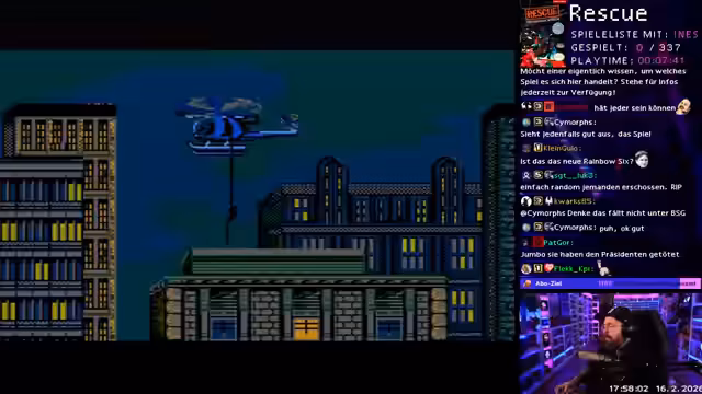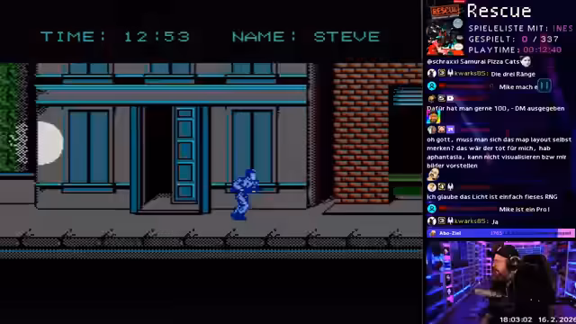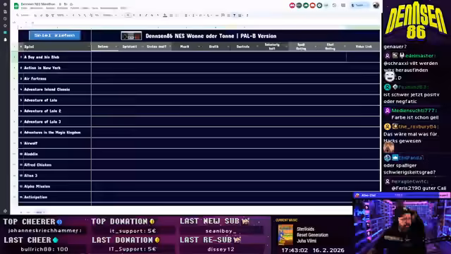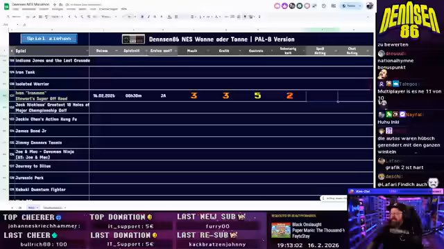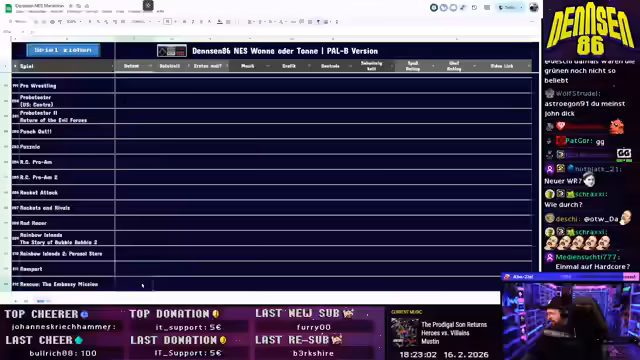 00:45:17Das neue 'Wonne oder Tonne'-Konzept wird nun live umgesetzt. densen86 öffnet eine Google-Tabelle mit allen PAL-B-NES-Spielen. Er zieht zufällig ein Spiel – 'Rescue the Embassy Mission' – und beginnt, es live zu spielen. Er erklärt das System: Er wird das Spiel für eine Stunde bewerten (Musik, Grafik, Controls, Schwierigkeit, Gesamt), während der Chat unabhängig davon ein Rating abgeben kann. Die Tabelle dient als offizielles Nachschlagewerk für alle gespielten Titel mit Links zu den jeweiligen VODs. Bei technischen Problemen mit der Software zeigt er sich lösungsorientiert und findet einen Weg, das Spiel zu starten.