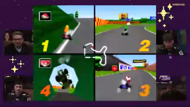01:22:02Beim Start des Mario Kart 64 Spiels auf dem N64 treten sofort technische und spielbedingte Hürden auf. Nach einem Reset des Systems fällt auf, dass die Grafik mit 240p und 20 FPS im Vergleich zu modernen Titeln sehr pixelig und flüssigkeitsarm ist. Der Streamer, der zur N64-Generation gehört, hat Schwierigkeiten mit der Steuerung, insbesondere mit dem Driften, und beschreibt das Steuergefühl als ekelhaft und ungewohnt. Spieler wie Musti, der das Spiel nie gespielt hat, haben zusätzlich Probleme mit der Orientierung und der fehlenden Minimap, was zu chaotischen und frustrierenden Rundenverläufen führt.