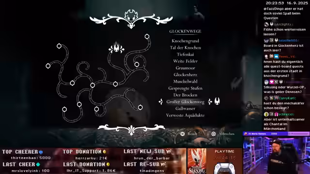 00:19:21Nach der Diskussion wird der eigentliche Silksong-Postgame-Stream gestartet. Der Streamer nutzt wie angekündigt eine interaktive Karte, um gezielt Questobjekte wie die Mossberry Stew zu suchen. Dies führt ihn in verschiedene Gebiete wie den Muschelwald und das Graumoor. Allerdings wird schnell deutlich, dass das Spiel ihm stressig vorkommt, insbesondere die oft unklare Kartendarstellung und das zeitaufwändige Navigieren ohne klare Hinweise.