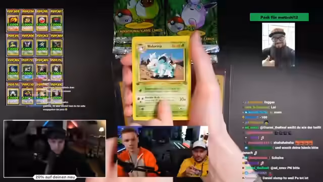 04:22:08Spendi hat einen extremen Jackpot gelandet und zieht eine sehr seltene und wertvolle Glurak-Karte aus dem Jungle-Set im Wert von mehreren tausend Euro. Dies löst große Euphorie aus. Anschließend ziehen weitere Streamer wie Rhyrex erfolgreich, die Chancen auf weitere Holos stehen weiterhin gut. Zabex hingegen erlebt das genaue Gegenteil und geht leer aus.