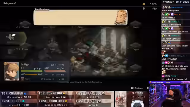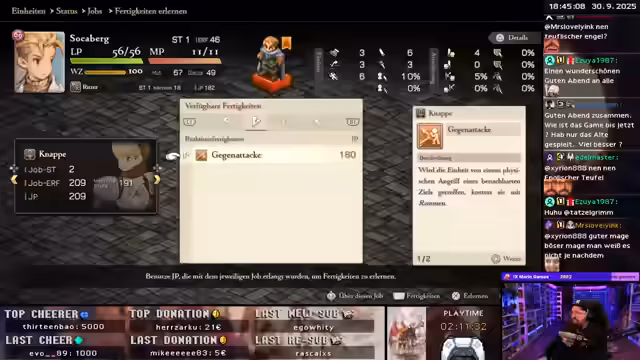 03:50:52Nach dem erfolgreichen Grindphase zeigen sich erste Fortschritte: Die Charaktere haben genügend Jobpunkte, um neue Fähigkeiten wie die Phönixfeder und den Supertrank zu lernen. Der Streamer rüstet alle Truppen mit entsprechenden Gegenständen aus, um diese Fähigkeiten nutzbar zu machen. Er verteilt zudem neue Ausrüstung wie Federhüte und Ledergewänder, um die Grundwerte der Charaktere zu verbessern, was sich positiv auf ihre Überlebensfähigkeit im Kampf auswirkt. Abschließend setzt er die Storymissionen fort und trifft auf Wiegraf, den Anführer der Leichenbrigade.