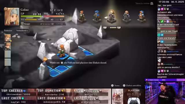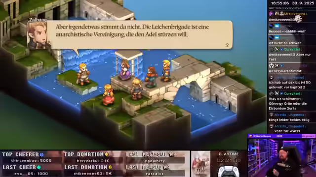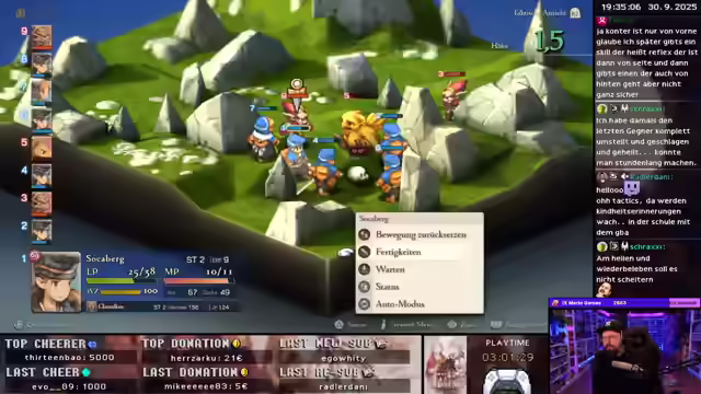 00:51:06Es beginnt eine ausführliche Erkundung des Spiels Final Fantasy Tactics. Es wird die Möglichkeit diskutiert, die Sprachausgabe auszuschalten, um sich auf das Lesen der deutschen Untertitel zu konzentrieren. Der Streamer äußert den Wunsch, die Texte lieber selbst zu lesen, um dem Geschehen besser folgen zu können. Es folgt eine detaillierte Auseinandersetzung mit den Steuerungselementen und Spielmechaniken, einschließlich Bewegung, Fertigkeiten und Zugreihenfolge. Es werden die verschiedenen Statuswerte und Jobklassen der Charaktere vorgestellt, wobei der Fokus auf den ersten Kampf und die Steuerung des Hauptcharakters Ramsa liegt. Es werden taktische Überlegungen angestellt, wie die Positionierung der Einheiten und die Nutzung von Fertigkeiten, um den Kampf zu gewinnen. Es wird die Möglichkeit der Markierung von Feldern und die freie Bewegung der Kamera erkundet. Es gibt eine detaillierte Analyse der verschiedenen Angriffsoptionen und deren Auswirkungen auf die Gegner. Es wird die Bedeutung von Job-Erfahrung und Stufenaufstiegen hervorgehoben, um neue Fähigkeiten freizuschalten und die Statuswerte der Einheiten zu verbessern.