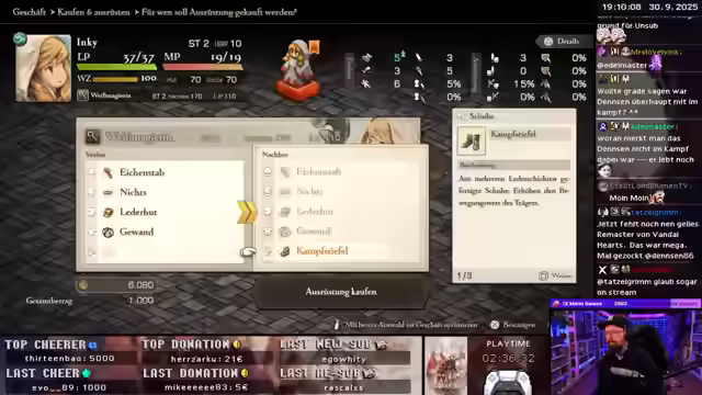 02:09:59Ein erneuter Kampf wird gestartet, um die Spielmechanik besser zu verstehen und die Charaktere weiterzuentwickeln. Diesmal stehen Chocobos als Gegner im Fokus. Es wird festgestellt, dass Ramsar für die Story wahrscheinlich mitgenommen werden muss. Die Namen der Gegner werden im Kampf angezeigt, und es wird auf Konterattacken geachtet. Es wird versucht, Jobpunkte zu farmen, um neue Fähigkeiten freizuschalten. Nach dem Kampf wird die Verwandlung einer Einheit in einen Kristall thematisiert, und es wird experimentiert, wie man die Fähigkeiten der verstorbenen Einheit übernehmen kann. Es wird festgestellt, dass Inki noch Jobpunkte benötigt, um den Job zu wechseln. Dingo wird zum Schützen ausgebildet und lernt die Fähigkeit Zielen 2. Es wird untersucht, ob Nelfal noch Sachen aus dem Chemikusbaum lernen kann. Die verschiedenen Fertigkeiten und passiven Fähigkeiten werden erkundet und ausgerüstet. Es wird festgestellt, dass die Kameraführung suboptimal ist und dass man im Prinzip grinden könnte. Es wird ein weiterer Kampf gestartet, um das Mana-System auszuprobieren. Es wird erkannt, dass es keinen Sinn macht, sechs Leute zu leveln, wenn man immer nur Fünfer-Truppen hat.