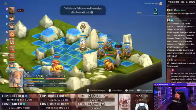 00:48:11Die ersten Kämpfe im Spiel werden vorgestellt, wobei das Kampfsystem im Detail erklärt wird. Jede Einheit kann pro Zug eine Bewegung und eine Aktion durchführen. Der Streamer erkundet die verschiedenen Jobs wie Knappe und Chemiker und die dazugehörigen Fähigkeiten. Besonderes Augenmerk liegt auf der Wirkungsprognose, die Schaden, Trefferwahrscheinlichkeit und andere Effekte anzeigt, sowie auf der taktischen Ansicht, die einen guten Überblick über das Schlachtfeld ermöglicht.