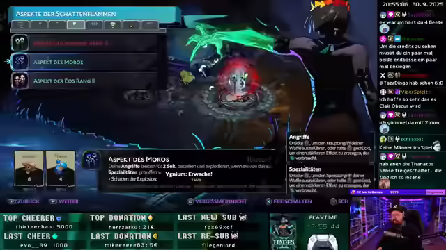 05:52:22Ein neuer Boss wird erreicht, der jedoch aufgrund von zu viel erlittenem Schaden und mangelndem Verständnis der Mechaniken nicht besiegt werden kann. Es wird überlegt, die Stärke zu verbessern und Hypnos aus seinem Schlaf zu erwecken, um die Story voranzutreiben. Ein geiler Run wird gelobt, und es wird überlegt, wie Psyche, Finsternis und Schatten optimal genutzt werden können. Es wird mit verschiedenen Waffen und Fähigkeiten experimentiert, darunter ein Dash-Angriff, der hinterrücks Schaden verursacht. Es wird beschlossen, erneut nach oben zu gehen und Zeus zu wählen, um den Build weiter zu verbessern. Verschiedene Götter werden besucht, um passende Skills zu finden, wobei der Fokus auf dem normalen Angriff liegt. Es wird festgestellt, dass der letzte Schlag der Angriffssequenz enormen Schaden verursacht, und es wird versucht, diesen zu optimieren. Trotz einiger vielversprechender Builds stellt sich heraus, dass das Spielgefühl etwas langweilig ist und es an einem gewissen Reiz fehlt.