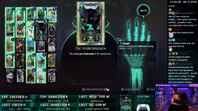 05:42:04Nach der erfolgreich Beschaffung der Feder für die Stärke-Karte und einigen teils brutalen Begegnungen startet der Streamer einen neuen Run. Er baut auf einen spektakulären Blutungs-Build auf, der durch Entladungen und Omega-Angriffe massiven Schaden verursacht. Trotz beeindruckender Schadenswerte und der Fähigkeit, Gegner durch Blitze zu verletzen, stösst er auf erhebliche Herausforderungen. Ein Kampf gegen den 'Vater aller Ungeheuer' endet knapp mit einem Sieg, bei dem er sein Glück am Rande des Untergangs auskosten musste. Am Ende des Streams ist die Begeisterung für das Spiel trotz der teils frustrierenden Momente gross.
