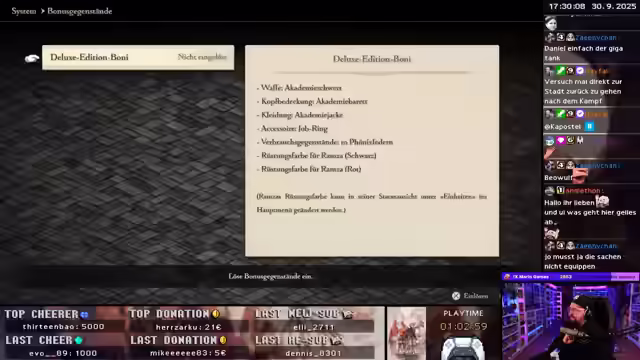 01:32:23Erste Einblicke in das Job-System von Final Fantasy Tactics werden präsentiert, wobei die Entwicklungspfade vom Knappen über Schütze und Ritter bis hin zu fortgeschrittenen Jobs wie Weiß- und Schwarzmagier demonstriert werden. Eine detaillierte Auseinandersetzung mit dem Gegenstandsmenü folgt, in dem die vorhandene Ausrüstung wie Eichenstab und Zepter inspiziert und die Chroniken als Informationsquelle zur Spielwelt hervorgehoben werden. Die Systemoptionen, inklusive Speichern des Spielfortschritts und Bonusgegenstände aus der Deluxe Edition, werden ebenfalls unter die Lupe genommen, wobei die Möglichkeit zur Änderung von Charakternamen als besonders interessant herausgestellt wird. Die Truppenaufstellung und die Unterschiede zwischen männlichen und weiblichen Charakteren werden kurz angeschnitten, bevor die erste Kampfsituation mit dem Schutz eines Gefangenen und der Vernichtung der Leichenbrigade im Fokus steht. Die Unterstützung durch spezielle Einheiten im Kampf wird erwähnt, zusammen mit der Option, den Automodus zu aktivieren, der jedoch abgelehnt wird. Es wird offensiv gespielt und die Kameraführung als störend empfunden.