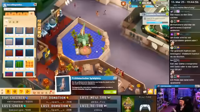 05:37:37Der Stream beginnt mit dem Bau und der Verwaltung eines Museums. Der Fokus liegt auf der Einstellung und dem Management von Mitarbeitern wie Nefal und Waschi, deren Gehalt und Zufriedenheit überwacht werden. Es werden verschiedene Ausstellungsstücke wie Skelette und Fossilien platziert und Infotafeln aufgestellt, um das Wissen der Gäste zu erweitern und die Begeisterung zu steigern. Das Management stößt jedoch auf Herausforderungen, da die Begeisterung der Gäste trotz Dekoration und Information nicht wie erwartet steigt.