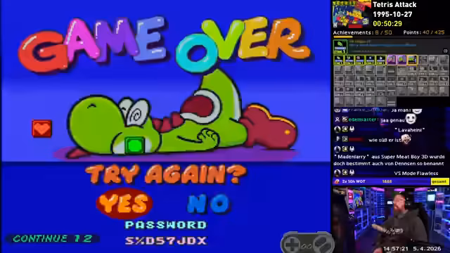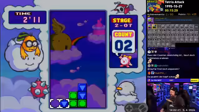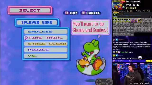 02:20:41Endlich entscheidet sich der Streamer für ein zufälliges SNES-Spiel. Er untersucht die Spielregeln und die Achievements, die er holen muss, darunter 'Survive two minutes in time trial' und 'Complete all the Yoshi puzzles'. Er startet mit dem einfachsten Modus, 'Stage Clear', um sich mit dem Spiel 'Puyo Puyo' vertraut zu machen und findet es zunächst 'ganz nett' und 'cool'.