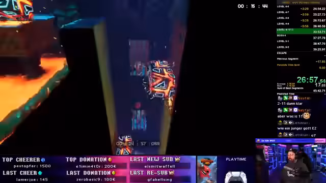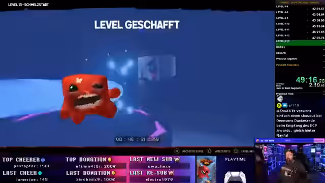 04:01:56Der Streamer beginnt mit dem Speedrun von Super Meat Boy 3D. Er nutzt die erhaltenen Splits und arbeitet sich durch die Level. Dabei kommentiert er den Schwierigkeitsgrad und berichtet über verschiedene Strategien und Todesmomente. Er erkennt schnell, dass einige Level sehr präzise gelöst werden müssen und der Verlauf des Runs von kleinen Fehlern und Glück abhängt. Der Fokus liegt auf einem flüssigen und schnellen Spielstil, auch wenn die Splits anfangs nicht optimal funktionieren.