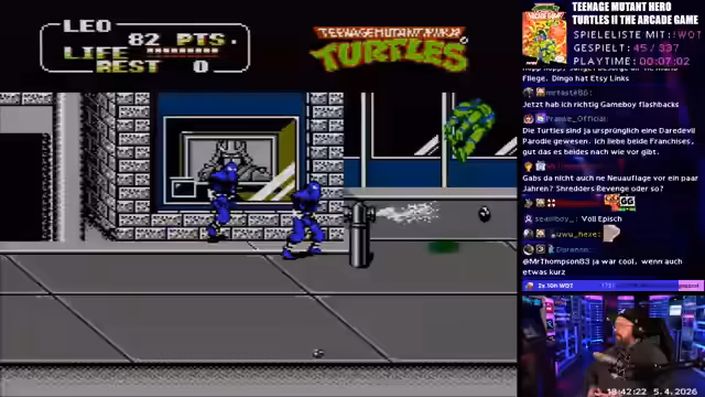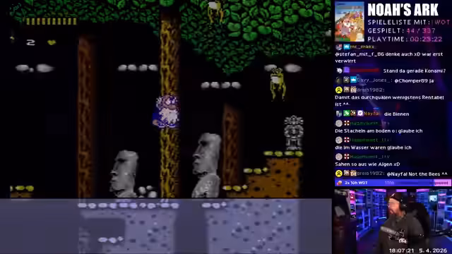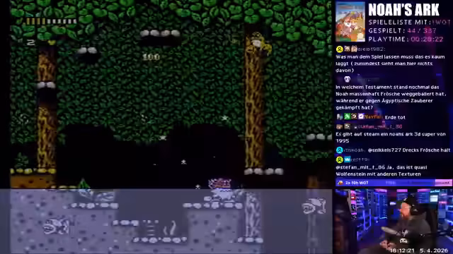 05:59:38Das Segment "Wonne oder Tonne" beginnt mit dem NES-Spiel "Noah's Ark". Der Streamer startet auf dem einfachsten Schwierigkeitsgrad und ist sofort von den ungewöhnlichen und kreativen Gameplay-Mechaniken begeistert. Das Spiel ist bizarre und absurd, was der Streamer sehr lustig findet. Die Level sind kurz und actionreich, was den Stream positiv überrascht und unterhält. Er bewertet das Spiel als ungewöhnlich, aber nicht schlecht.