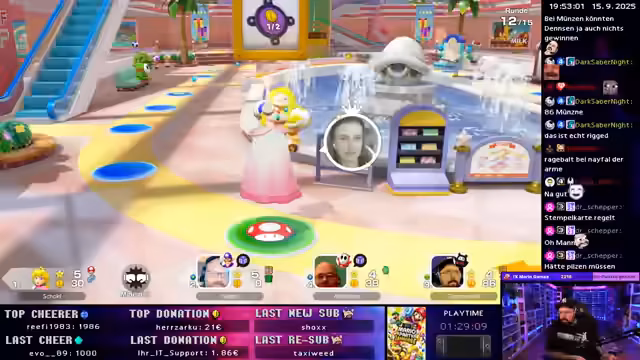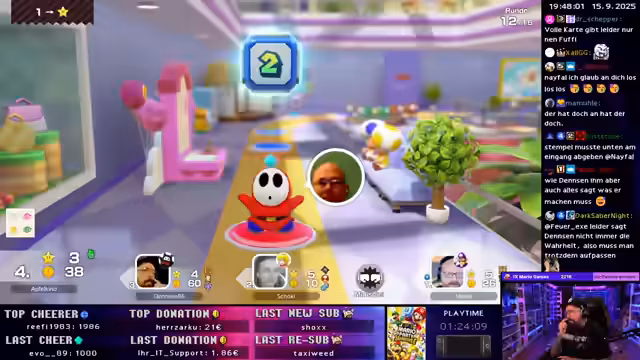 02:49:35Zu Beginn des Streams treten technische Schwierigkeiten im Mario Party-Spiel auf, das den Streamer gefangen hält und nicht weiterlässt. Nach einem Neustart und der Erwartung eines simulierten Spielfortschritts, der jedoch ausbleibt, gelingt schließlich der Ein ins Spiel. Die Spieler wechseln sich ab und erleben einen knappen Sieg in einem Minispiel, wobei die zufällige Generierung von Spielzügen kritisiert wird. Das Gameplay wird durch die unterschiedlichen Startpositionen und das unvorhersehbare Verhalten des Spiels geprägt.
