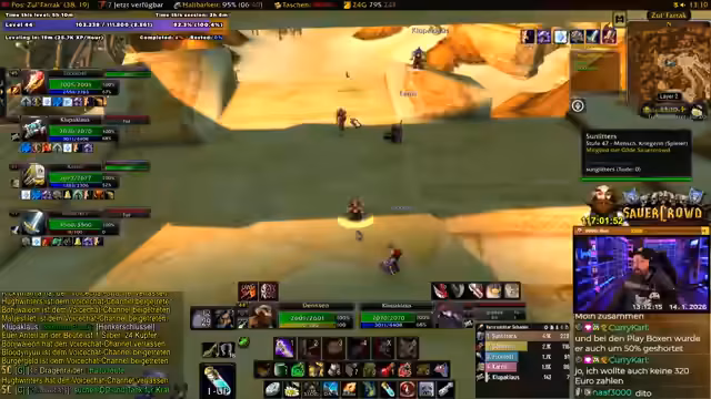 01:40:00Die Dungeon-Gruppe für Zul'Farrak wird mit Kluper Klaus (Heiler) und Sunlitus (Tank) zusammengestellt, wobei die Gruppen动态ik durch frühere Konflikte beeinflusst ist. Diskutiert wird die Aufgabenverteilung – der Streamer bietet an, selbst als Heiler zu spielen, um den Tank zu unterstützen. Es folgt eine Planung von Quests und Loot-Möglichkeiten im Dungeon, einschließlich der Notwendigkeit, spezifische Gegenstände für die Riemenpflichtigkeiten zu farmen.