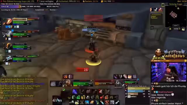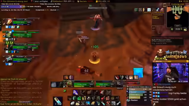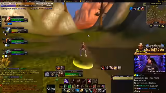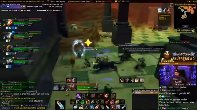 06:01:39Die Gruppe kämpft in Uldaman, mit Fokus auf AoE-Schaden durch den Magier 'Fix'. Der Streamer diskutiert seinen AoE-Build, bei dem Blizzard tumors schwächt, aber den Schaden nicht steigert. Sie bereiten sich auf einen Boss vor, buffen sich mit Essen und Tränken, und überlegen Talentverteilung für Dual-Spec. Es geht um Strategie, Cooldown-Management und die Herausforderung, in einer Gruppe mit verschiedenen Klassen effizient zu kämpfen. Der Streamer zeigt sich beeindruckt vom Schaden des Magiers.