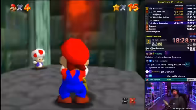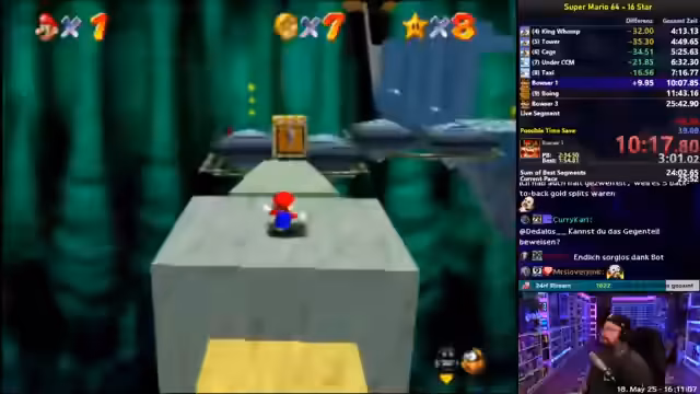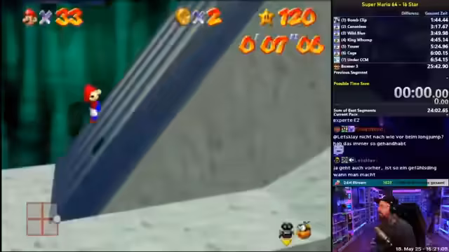 01:47:58Der Streamer begann mit dem Üben von Mario 64 Speedruns. Dabei konzentrierte er sich auf das Erlernen der Bewegungsgrundlagen und der Einrichtung des Trainingsraums. Er hat sich das Ziel gesetzt, seine persönlichen Bestzeiten zu verbessern, indem er viele Wiederholungen macht und dabei strategische Tricks anwendet, wie zum Beispiel das Bomb-Clip.