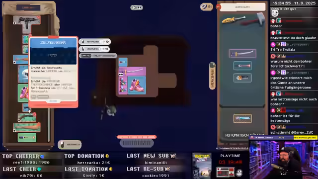 01:30:52Zuerst konzentriert sich der Streamer darauf, sein Inventar zu verwalten und Items zu optimieren. Er platziert Revolver und eine Pumpe strategisch und stößt auf das Problem, dass ein Inventar-Slot fehlt. Er handelt schnell, entscheidet sich für Turboschuhe und Granaten, um seine Bewegungsgeschwindigkeit und den Schaden zu maximieren. Er kauft und platziert verschiedene Items wie eine Luftpumpe und eine Uzi und baut sein Setup so um, dass er möglichst schnell rennt, um das Gefahrenlevel niedrig zu halten.