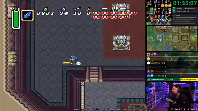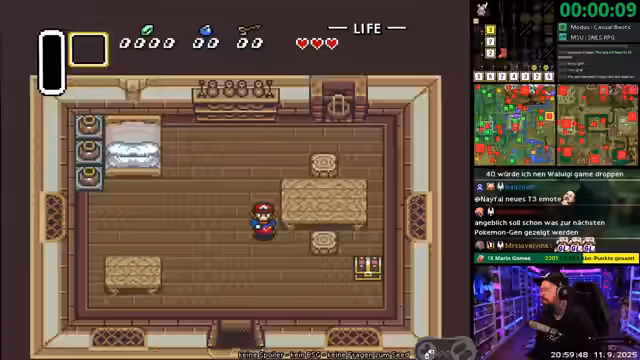 05:39:26Der Streamer beendet einen Dungeon im Spiel und erhält den Feuerstab, was ihm erlaubt, weitere Gebiete zu erkunden. Die Suche nach einem verbleibenden Gegenstand ist für ihn entscheidend, um zu verhindern, dass das Spiel als Eastern (ein ungünstiger Spiel-Modus) endet. Mit Hilfe eines Spiegels erhält er Zugang zur dunklen Welt und kann so auf zusätzliche Bereiche zugreifen. Die persönliche Anpassung des Spiels mit einem Mario-Sprite wird erwähnt, was den Stream-Charakter unterstreicht und für neue Zuschauer eine besondere Präsentation bietet.
