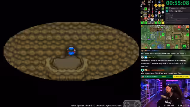 04:35:42Nachdem der Streamer im Spiel vorankommt, plant er einen Wechsel des Formats. Er kündigt ein Zelda-Community-Race an, das um 21 Uhr stattfinden wird. Bei diesem Rennen treten Teilnehmer in einem zufällig generierten 'Link to the Past' gegeneinander an, um als Erster das Spiel zu beenden. Er erklärt den Prozess der Benennung von Spiel-Seeds, der aufgrund eines unorganisierten Desktops als umständlich beschrieben wird. Parallel dazu plant er einen Stream zur bevorstehenden Nintendo Direct am nächsten Tag.