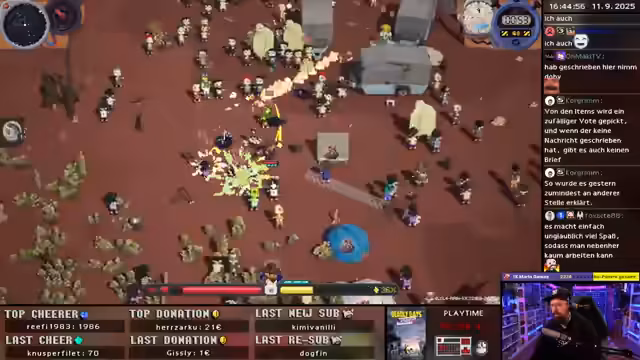 01:01:19In den nachfolgenden Levels wird der Kampf um Beute und das Sammeln von Sprit zur Hauptaufgabe. Der Streamer erkennt, dass Geschwindigkeit hier der Schlüssel zum Erfolg ist. Items wie 'Laufschuhe' und 'Magnet' werden unverzichtbar, da es ermöglicht, aus der Distanz Items einzusammeln, ohne direkt in Gefahr zu geraten. Die Socken, die Schaden und Geschwindigkeit erhöhen, erweisen sich als extrem wertvoll.