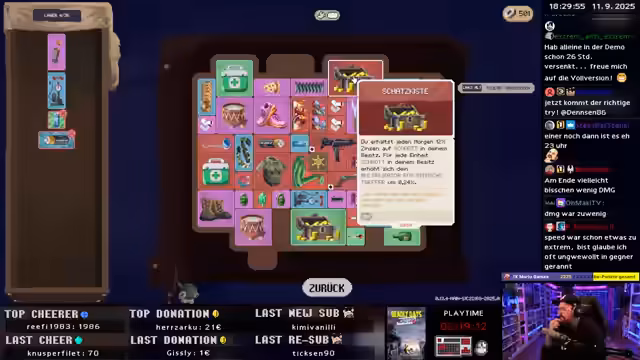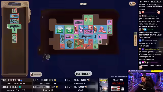 00:17:14Nach einer kurzen Wette startet das Spiel mit dem Charakter Sheriff. Die erste Runde verläuft sehr erfolgreich, da der Streamer schnell viel Beute und Rucksäcke sammelt. Er findet neue Items wie die einhändige Uzi und kann durch die Twitch-Integration des Chats Unterstützung bei der Entscheidungsfindung erhalten. Der Beginn ist vielversprechend und legt eine starke Basis für das Erreichen des Highscores.