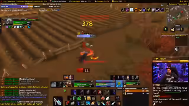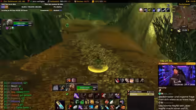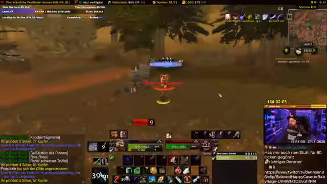 02:21:23Der Streamer ist kurz vor Level 60 und denkt über das Ende des Grinds nach. Er ist zu 99,9% sicher, dass er es schaffen wird, wenn es keine technischen Probleme gibt. Er scherzt, dass die NPC-Wachen einen 'Ruhestand' genießen. Er blickt nach vorne auf zukünftige Aktivitäten wie das Farmen von Rezepten oder die Erkundung von Scholomance.