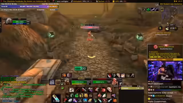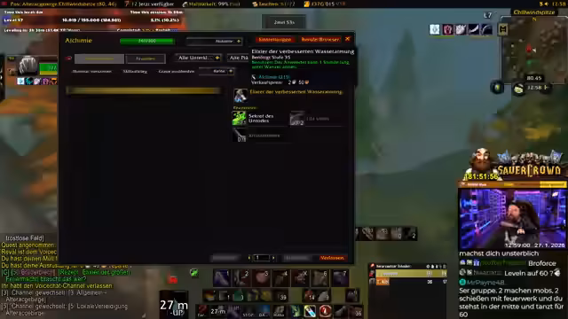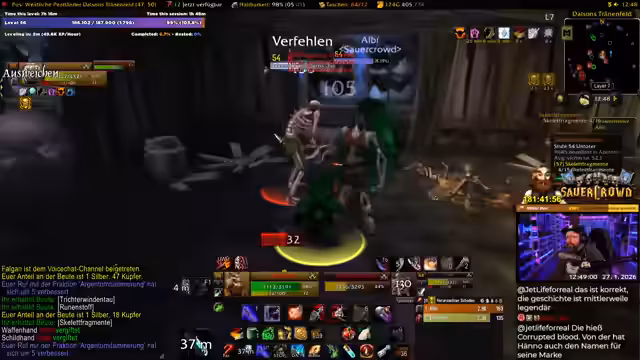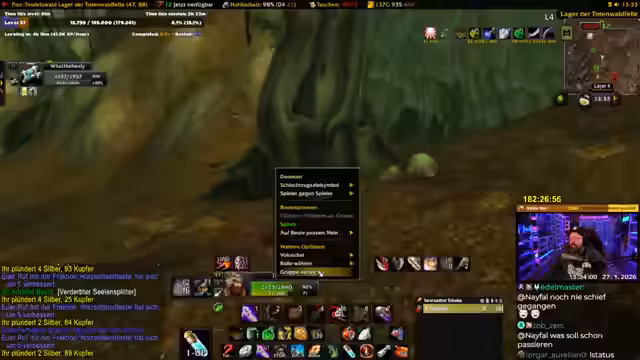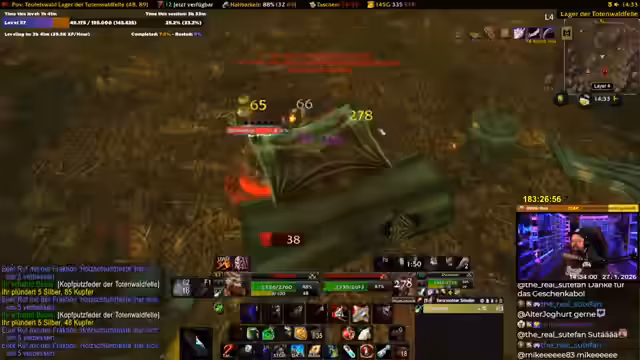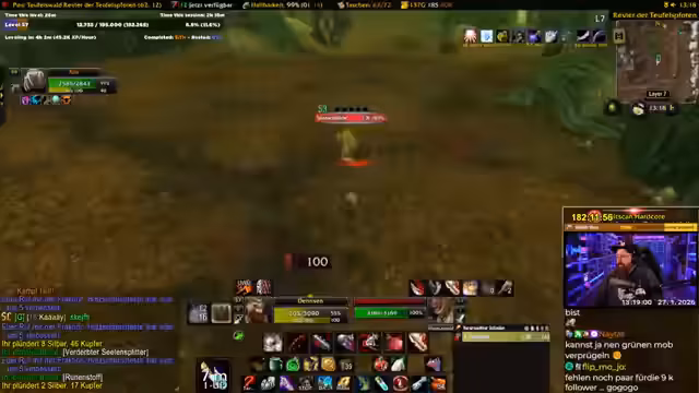 00:17:31Ein Meilenstein des Streams ist die Ankündigung, dass dies der letzte Tag vor einer Reise in die USA und somit der letzte Tag intensiven WoW Grinds ist. Es sind 7 bis 8 Stunden geplant. Der Streamer will Level 58 erreichen, realisiert aber, dass Level 60 unrealistisch ist. Die Berufe Alchemie und Kräuterkunde werden gefördert, indem Geisterpilze, Golddorn und Sonnengras gefarmt werden. Der eigentliche Grind findet in den Westlichen Pestländern statt.