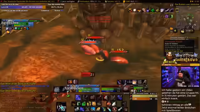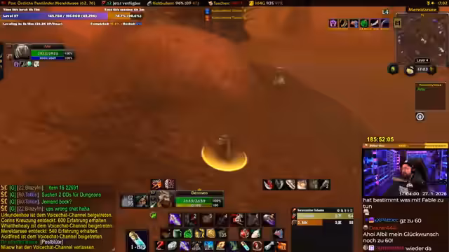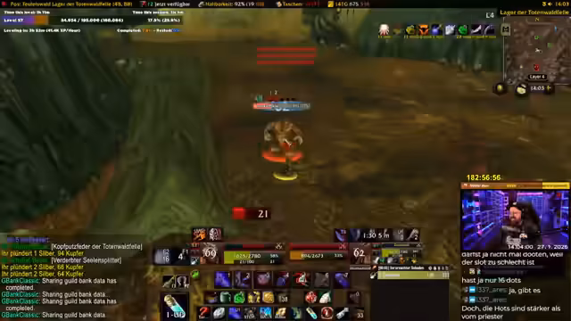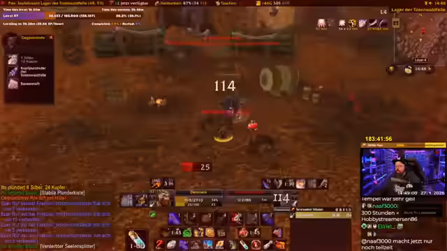 02:53:00Nach dem Erreichen des Maximallevels wird der Fokus auf das Gebiet Silithus gelegt. Hier wird intensiv gequestet und farmt, da es viele Quests und gute Drops gibt. Es wird der Ruf mit dem Zirkel des Cenarius erwähnt, und es gibt Pläne, bestimmte Sets wie das T0-Set oder Tier 2 zu farmen. Die Gefahr durch hochstufige Patrouillen in der Wüste wird ebenfalls angesprochen.