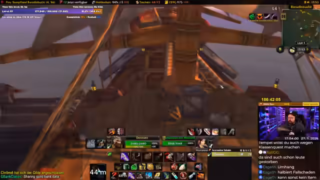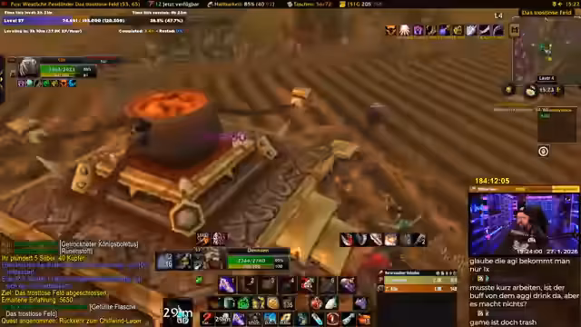 04:14:11Der Streamer beschäftigt sich intensiv mit Spielmechaniken und stößt dabei auf Frustrationen. Es werden Bugs bei Buffs, wie das Überschreiben von Tränken thematisiert. Zudem empfindet er bestimmte Areale wie das Arathi-Hochland als besonders nervig, was zu Ärger führt. Auch seine mangelnde Erfahrung als DD im Dungeon wird angesprochen, die ihn überfordert. Seine Stimmung schwankt zwischen Begeisterung für das Event und reiner Wut über das Spiel selbst, was zu einem emotionalen Achterbahnfahr des Streams führt.