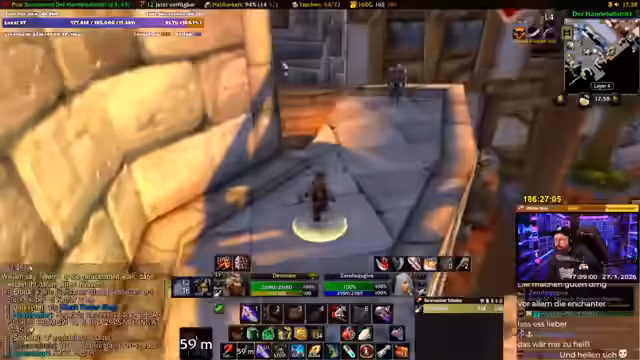 06:01:03Die Vorbereitungen für den Amerika-Aufenthalt laufen. Der Streamer erwähnt, dass er nur noch bis 59,5 leveln wird und danach Pause macht, da die Daten in Amerika knapp sind. Es werden Pläne für den weiteren Spielverlauf nach der Reise geschmiedet, wie das Erreichen von Level 60 und das Nutzen von Portalen, um Buffs in der Hauptstadt zu erhalten. Der Fokus liegt darauf, den Spielcharakter in einem optimalen Zustand zu lassen.