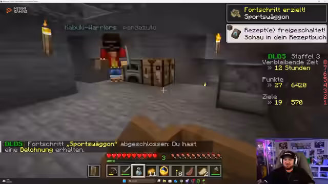 00:04:01Der Stream beginnt mit dem Start des DLDS Events 'KABUKI WARRIORS' in Minecraft. Der Streamer hat versehentlich Sane statt des geplanten Teammitglieds eingeladen und muss die Einladung korrigieren. Zusammen mit @PANDAZUT0 ntgaming ist das Ziel, Achievements zu sammeln, um Punkte zu holen, ohne zu sterben. Die Map ist auf hart eingestellt und das Team plant, zunächst sehr vorsichtig zu agieren, eine sichere Basis einzurichten und Rüstung herzustellen, bevor es risikofreudiger wird. Ein ständiger Fokus liegt auf dem Sammeln von Ressourcen wie Eisen und Holz.