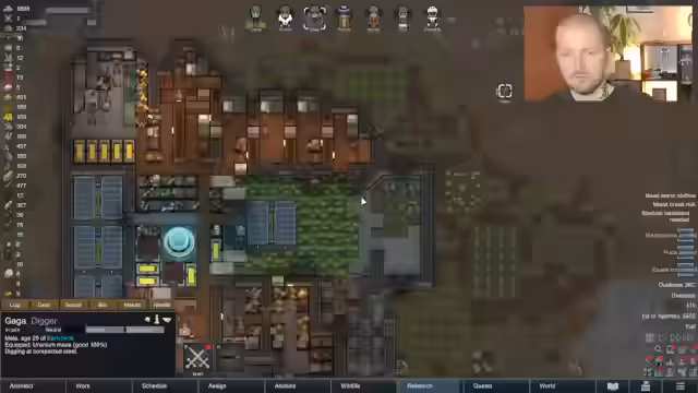 02:24:23Nach dem Angriff wird der Fokus auf den Wiederaufbau und die Verbesserung der Verteidigungsanlagen gelegt. Priorität hat nun die Erforschung von Microelectronics, um Mörser bauen zu können, und Hydroponics, um die Nahrungsmittelproduktion zu sichern. Gleichzeitig wird die Basis erweitert, um mehr Platz für Schlafen, Arbeiten und Lagerung zu schaffen.