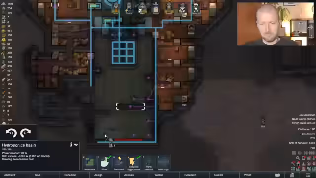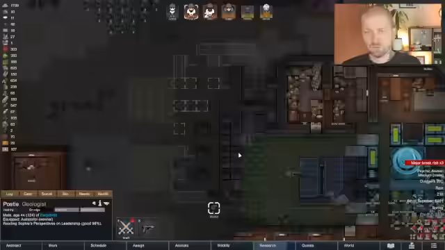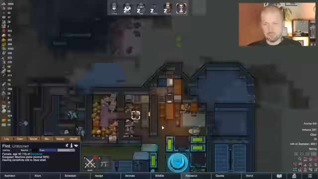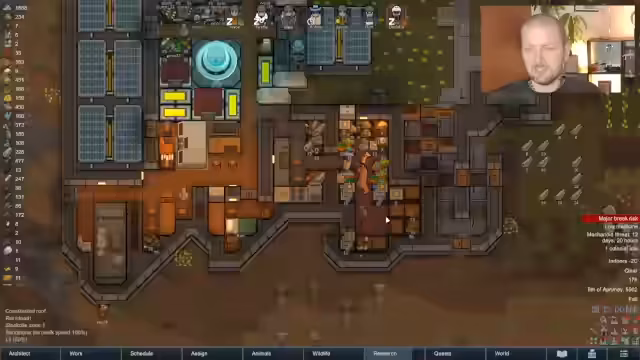 03:50:12Ein Muskel-Parasiten-Befall befällt einen Großteil der Kolonie, was die Arbeitskraft weiter einschränkt. Gleichzeitig wird mit dem Umbau der Basis begonnen, um einen zentralen Schlafflur für effiziente Verteidigungsreaktionen zu schaffen und die Nutzung des Raums zu optimieren. Die unproduktive Flint wird aus der Siedlergruppe entfernt.