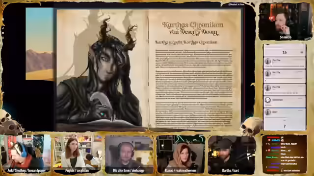 00:51:17Es erfolgt der Übergang zum Pen & Paper-Spiel Desert Doom. Technische Vorbereitungen werden getroffen, wie das Anpassen des Titels und das Anrufen der Teilnehmer. Es wird über technische Probleme gesprochen, wie zum Beispiel Schwierigkeiten mit OBS-Links und Audioeinstellungen. Es gibt ein Gespräch über Boomer-Probleme im Zusammenhang mit Technik und die Unfähigkeit mancher Lehrer, mit Computern umzugehen. Anekdoten über technische Unverständnis werden ausgetauscht. Die Teilnehmer verbinden sich für das Spiel, und es gibt kurze Gespräche über Charakterblätter und Würfelglück. Es wird erwähnt, dass es sich um die neunte Session von Desert Doom handelt, und ein Intro wird abgespielt. Während des Intros gibt es Beschwerden über die laute Musik, und es wird über Audioeinstellungen in verschiedenen Programmen diskutiert.