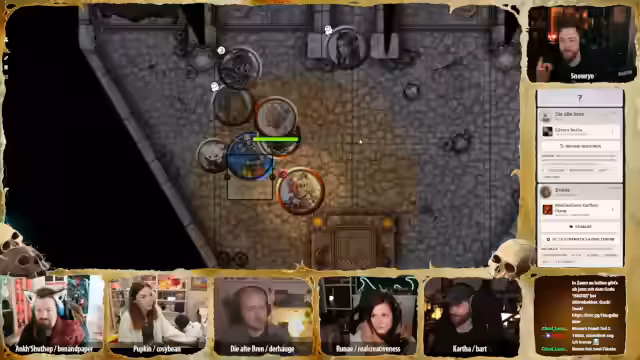 02:06:16Die Gruppe kämpft gegen zwei Skelette, wobei Brenn mit einer Bratpfanne die Knie der Skelette zertrümmert und Feuerschaden verursacht. Katha unterstützt mit Zaubern. Währenddessen wird Runay von Enidie angegriffen und erleidet eine Stichverletzung durch ein Säbel. Es wird diskutiert, ob Runay eine Gelegenheitsattacke auslösen kann, als Enidie versucht, ihr das Schwert zu entreißen. Runay wehrt sich, indem sie sich wegdreht und versucht, das Schwert selbst herauszuziehen. Brenn wirkt Silvery Barbs, um Runay zu helfen, dem Angriff auszuweichen. Enidie wird schließlich durch eine kombinierte Anstrengung besiegt, wobei eine Faust aus dem Boden ihn ergreift und zerdrückt. Nach dem Kampf wird festgestellt, dass Runay noch ein Säbel in der Schulter steckt, das nekrotischen Schaden verursacht. Brenn versucht, das Schwert zu entfernen, wird aber von einer Blutgier übermannt und lässt es fallen. Schließlich wird Runays Wunde mit einem Halstuch verbunden und sie erhält ein Gesundheitsbonbon.