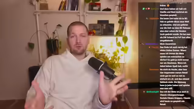 00:52:37Die Unterhaltung weitet sich zu einer allgemeinen Diskussion über World of Warcraft aus. Streamer teilt seine persönlichen Erfahrungen von Vanilla bis Warlords of Draenor, wobei er Cataclysm und Warlords besonders kritisiert, da diese Add-ons nach seiner Ansicht das Gefühl von Gemeinschaft und Entdeckung durch Features wie Garrison vernichtet hätten. Er stellt klar, dass er "Retail nicht bashen" will, es ihn aber einfach nicht mehr interessiert. Er sieht den Kern des Problems in der veränderten Spielphilosophie: Der Weg zum Raid-Endcontent sei zu abstrakt und min-max-orientiert geworden, wodurch viele Spieler die Motivation verlieren, die eigentlich besseren Raids zu erreichen.