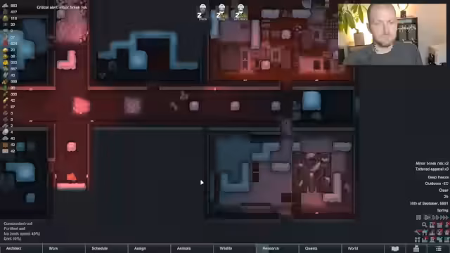 01:35:16Nach einem erfolgreichen Kampf werden Leichen nicht sofort beerdigt, was zu Unzufriedenheit und negiven Launen der Kolonisten führt. Ursache ist eine falsch eingestellte Priorität für die Beerdigungszonen. Gleichzeitig wächst die Unzufriedenheit, da Bewohner durch Müll, veraltete Möbel und ein trostloses Krankenhausambiente belastet werden.