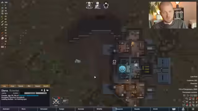 01:12:45Um die miserable Stimmung im Team zu verbessern, wird ein neuer Recreation-Bereich aus menschlichem Leder gebaut, was die Moral der Kolonisten deutlich anhebt. Gleichzeitig wird ein wilder Muffalo gezähmt und zur Milchproduktion genutzt. Eine strategische Entscheidung wird getroffen: Der Muffalo wird nicht geschlachtet, sondern an einem abgelegenen Ort angebunden, um die Wolle zu gewinnen und die Nahrungskrise ohne Verlust einer wichtigen Ressource zu bewältigen.