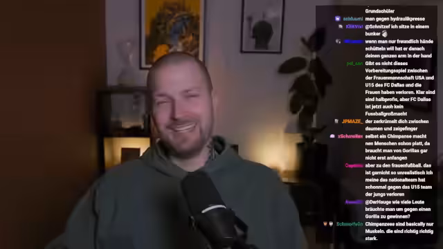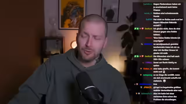 01:04:32Es wird eine unterhaltsame und teilweise wissenschaftliche Diskussion über hypothetische Kämpfe zwischen Menschen und Tieren geführt. Die Vorstellung, ein Erwachsener könne einen Gorilla besiegen, wird als völlig absurd abgetan. Auch die Annahme, Hobby-Fußballer könnten gegen die Frauennationalmannschaft ein Tor schießen, wird als 'Delulu' bezeichnet. Der Streamer schlägt sich selbst bei einem Kampf gegen eine Ziege mit abgerundeten Hörner eine Chance aus, während er für andere Tiere wie Robben oder Schwarzbären keine realistische Siegschance sieht.