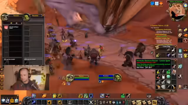 00:38:27Während des Streams farmt die Gilde aktiv Zentauren in der Oase, um die Quest 'Kolkar' abzuschließen und spezielle Beutetruhen mit seltenen Items zu öffnen. Bei diesen Aktionen werden häufig Mobs aus anderen Layers gesucht, was durch ein spezielles Addon möglich ist, das auch Spieler auf anderen Schichten anzeigt. Die Gruppe teilt Beute, die sie nicht direkt benötigt, und beliefert damit Gildenmitglieder, die sie brauchen. Zwischen den Kämpfen wird der Spaß an der Gemeinschaft betont, und der Streamer interagiert ständig mit der Chat-Community, die ebenfalls als Schlingel bezeichnet wird.
