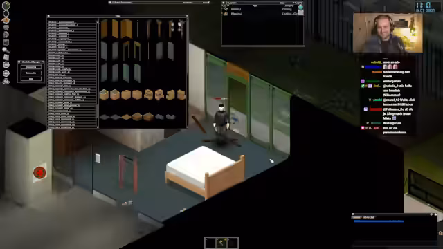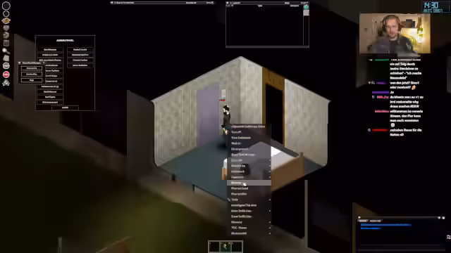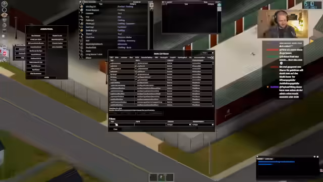 01:25:57Der Streamer wechselt den Bildschirm, um die Mod-Liste und die Werkzeuge eines Game-Masters im Spiel zu demonstrieren. Im Admin-Ghost-Modus ist er unsichtbar für andere Spieler. Er interagiert mit der Welt, um eine detaillierte Szene für einen Spieler zu inszenieren. Dazu gehören das Platzieren von Leichen, das Spawnen von Gegenständen und das Erzeugen von atmosphärischen Elementen wie Lagerfeuern, um eine glaubwürdige Umgebung zu schaffen, in der der Spieler eine Geschichte entdecken kann.