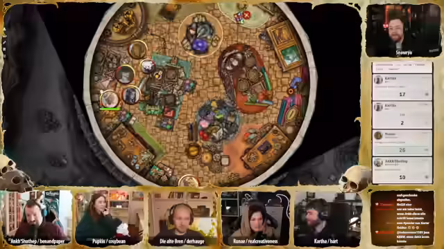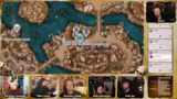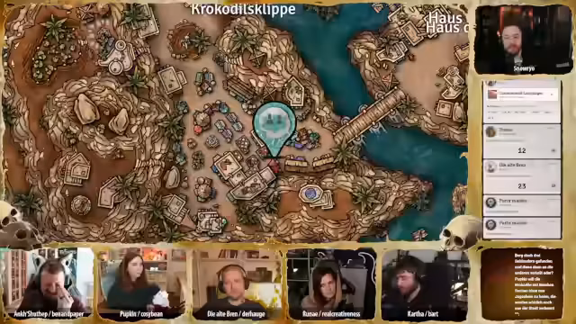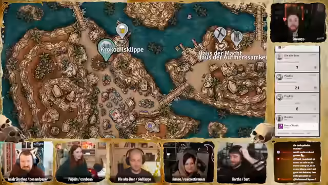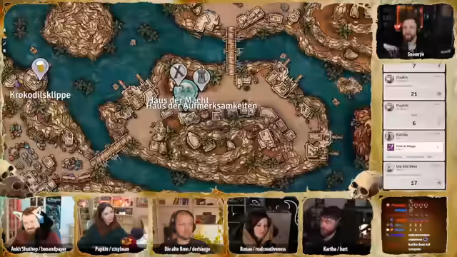 00:56:34Nachdem alle technischen Probleme behoben sind und alle Mitspiager bereit sind, beginnt das Pen & Paper-Spiel mit dem Intro. Der Spielleiter begrüßt die Gruppe und die Zuschauer zur vierten Session von "Deserts Doom". Er beginnt damit, die Ereignisse der letzten Session zusammenzufassen. Die Gruppe befindet sich in der Stadt Glimmerscale und hat das Restaurant "Anks Pupkins Nachtisch" besucht, wo eine mysteriöse Verunreinigung eines Nachtischs mit kopflosen Käfern aufgedeckt wurde. Dies führt die Gruppe zu einer Reihe von Verdächtigen und tiefer liegenden Geheimnissen.