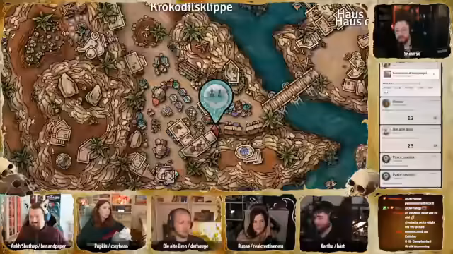 00:58:58Der Streamer freut sich auf die neue Session und klärt die Schreibweise des Namens eines Teilnehmers. Es wird eine von einem Zuschauer gezeichnete Katachronik gezeigt. Eine Zusammenfassung der vorherigen Session wird gegeben, die sich um Ereignisse in Limmerscale dreht. Die Gruppe befindet sich in der Krokodilsklippe und teilt sich ein Zimmer, das sie aufgrund eines Vorfalls mit einem Kopf in der Suppe kostenlos erhalten haben. Es wird vermutet, dass dies eine Warnung oder ein böses Omen ist. Die Gruppe versucht herauszufinden, wer für den Vorfall verantwortlich ist, wobei verschiedene Personen verdächtigt werden. Es werden Informationen über den Fluch Grabfäule gesammelt, der tödlich ist und Essen verfaulen lässt. Betroffene können untot werden und tragen schwarze Linien auf dem Körper. Es wird betont, dass man keine Sandpartikel einatmen sollte. Die Gruppe sucht nach Hinweisen auf den Roten König und spricht mit verschiedenen Personen, darunter Crackstone, der Rätsel liebt. Am Ende der Zusammenfassung wird erwähnt, dass die Gruppe sich nun mit Tobrem treffen wird, der wegen einer zerbrochenen Statue aufgebracht ist. Nach der Zusammenfassung beginnt die neue Session mit dem Wechsel nach Glimmer Scale.