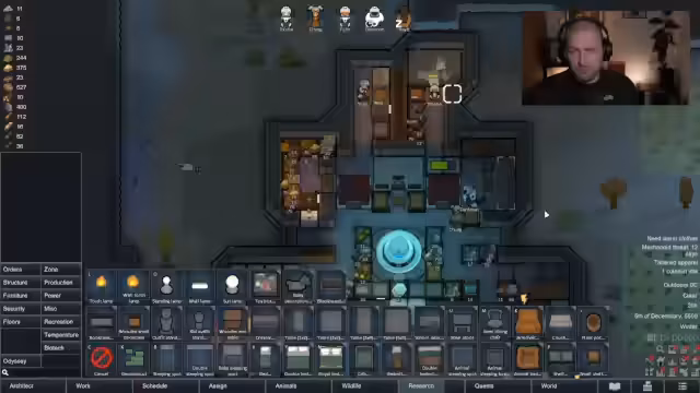 03:01:47In Rimworks wird die Kolonie stark erweitert. Es werden Zellen für neue Gefangene gebaut und ein Rekrutierter Charakter mit den Fertigkeiten Construction 2, Research 3 und Growing 2 in die Siedlung integriert. Der Fokus liegt auf der Optimierung der Raumeinteilung, dem Bau einer Verteidigungsanlage mit Geschütztürmen und der Sicherung der Nahrungs- und Ressourcenvorräte, insbesondere da der Strom knapp wird.