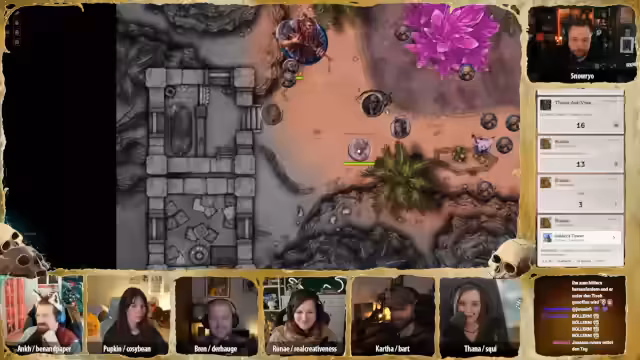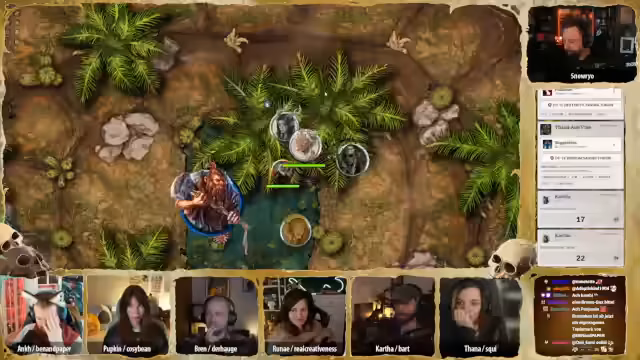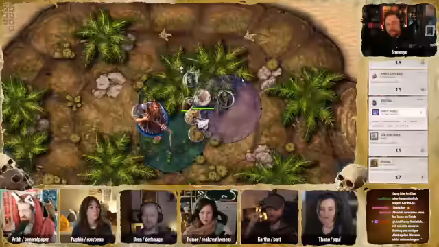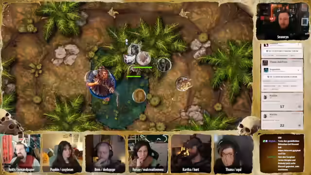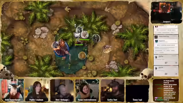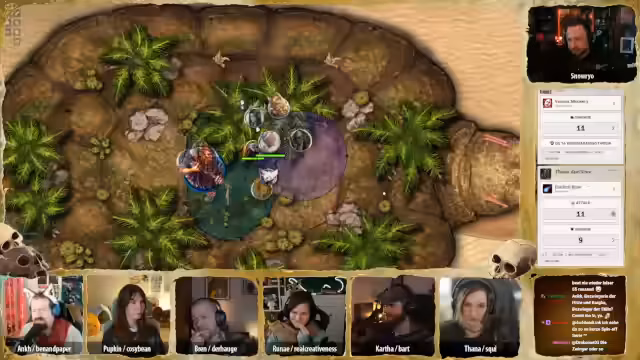 01:33:44Das Pen & Paper-Spiel beginnt mit Session 35. Die Gruppe ist im Sandturm und hat einen Kampf gegen eine Knochenschlange gewonnen. Es finden Gespräche und Rituale statt, um sich auf die bevorstehende Reise vorzubereiten. Die Charaktere entwickeln sich weiter, und Spannung entsteht, als Tana eine spirituelle Verbindung zu Pappkin's Gebet spürt.