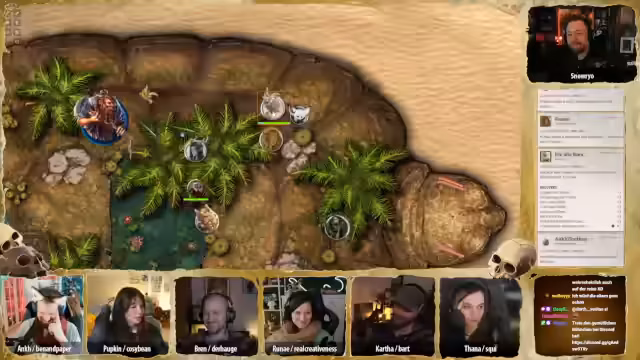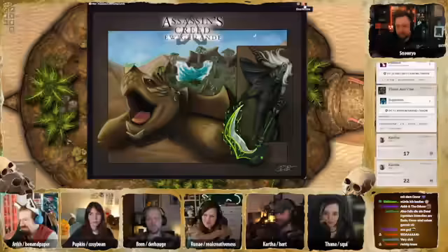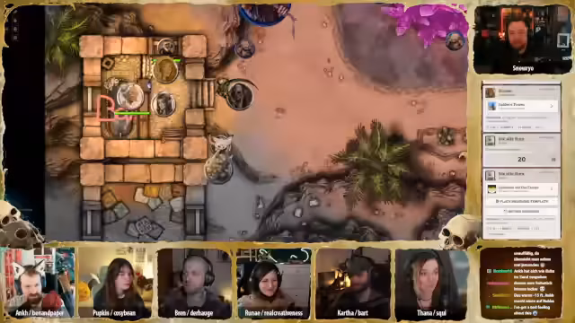01:21:37Nach dem entspannten Aufbau der Basis wechselt der Stream zum Pen & Paper-Rollenspiel 'Deserts Doom'. Es geht direkt in das hohe und passtige Intro, das die Spieler in die Welt der Wüste eintauchen lässt. Der Fokus liegt auf der Fortführung der Geschichte rund um den Versuch, die Wiederauferstehung des Pharaos zu verhindern.